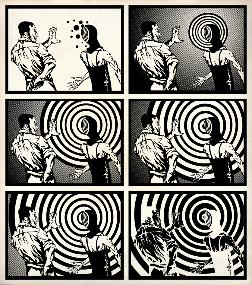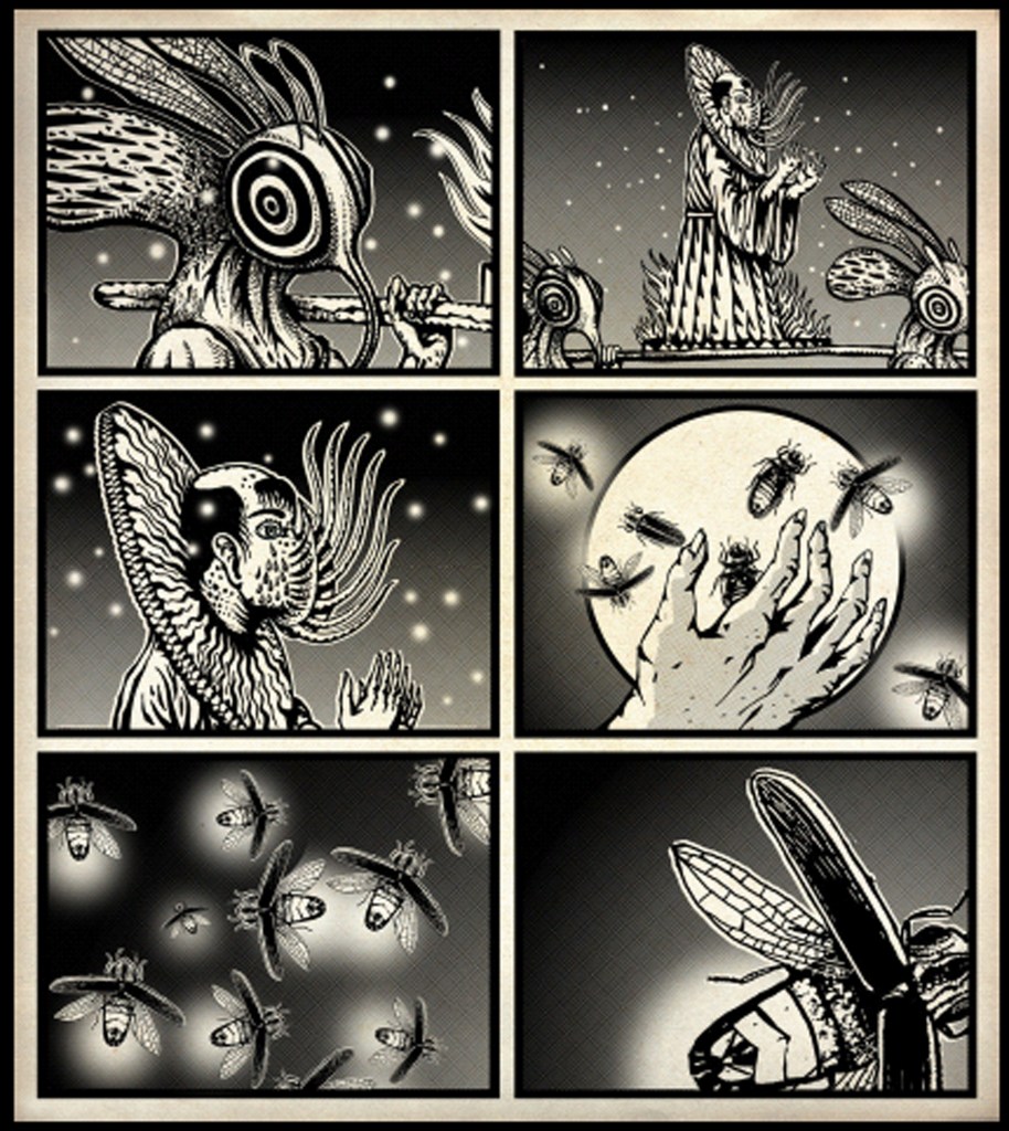 El diseño visual de Informe Tunguska es extraordinariamente heterogéneo. Algunos paneles contienen dibujos toscos con gruesas líneas negras, amplias franjas de un solo color, una perspectiva aplanada y un efecto deliberadamente bidimensional. Otros paneles adquieren la complejidad de los detalles y las sombras sutiles del fotorrealismo, con algunos marcos que utilizan fotografías de formas vegetales o rocas para proporcionar texturas de fondo o representar cielos tormentosos. Los tintes rojos dan un tono apocalíptico a estos fondos o resaltan la carne humana dolorosamente expuesta. Hay un grado inusual de separación entre el texto y la imagen. Los globos de diálogo se eliminan por completo y muchos paneles no contienen texto, mientras que algunas páginas se dedican por completo a los informes escritos; los pies de foto que existen suelen ser citas de otros textos, de Borges, Kafka o los escritores del Antiguo Testamento, entre otros. Este modo de construcción intertextual se anuncia en el propio texto, ya que uno de los personajes refleja que ‘es como si viviésemos en una fantasía real, habitantes de un mundo construido a partir de una mezcla de historias’. en una fantasía de la vida real, habitantes de un mundo construido a partir de una mezcla de historias). En una inversión del proceso creativo habitual en la ficción gráfica, El guión de Figueroa no sirvió de base para las ilustraciones de Romo; en cambio, los textos se inspiraron en las imágenes de Romo y se tejieron a su alrededor.3 La relación más laxa entre texto e imagen permite una mayor polisemia y le da al Informe Tunguska la calidad miscelánea y desorganizada de un archivo. Hay un juego constante en Informe Tunguskacon escala y similitud, en el que se utilizan técnicas de encuadre y teleobjetivo para erosionar la distinción entre mundos humanos y no humanos. La primera parte del texto se abre con una secuencia de alejamiento de dos etapas que se enfoca en los pétalos y filamentos de una flor. El encuadre apretado no nos permite ubicar la imagen en su contexto hasta el tercer panel. Aquí nos damos cuenta de que lo que hemos estado viendo es un diseño impreso en la portada del libro, en el que la flor se ha convertido en parte de un logotipo institucional para un campo de concentración. Una secuencia hacia el final de la segunda sección se construye mediante una técnica similar. Primero se nos muestra una forma que parece ser la representación de una especie de insecto, posiblemente de un hábitat marino, con círculos concéntricos en lugar de ojos y aletas y antenas muy dibujadas. Las elaboradas aletas y frondas del organismo recuerdan a las criaturas marinas de Art Forms in Nature (1904) de Ernst Haeckel, que despliega ante nosotros la sorprendente belleza, las simetrías y la intrincada ornamentación de las formas naturales, proporcionando una gran fuente de inspiración para el arte y el diseño en El tiempo de Haeckel y más allá. A medida que pasamos la página, sucesivos zoom-outs revelan que las criaturas de Romo son, de hecho, parte de un diseño para la tela de un sillón. Por todas partes en Informe Tunguska , las formas y los patrones de la naturaleza se cooptan para su uso en la cultura humana y, a menudo, se presentan de tal manera que inicialmente nos engañan para que percibamos la flora y la fauna orgánicas, donde luego vemos diseños o adornos creados por manos humanas…