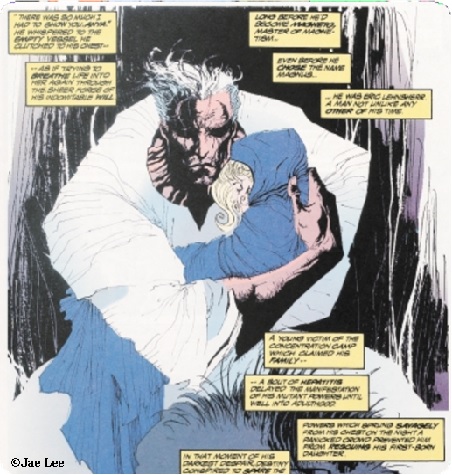 En la parte artística, quien ilustra esta página es nada menos que Jae Lee, quien saltó a la fama dibujando su inconfundible versión de Namor para la editorial Marvel, y luego el título Hellshock de Image, últimamente también ha estado en la palestra por la censura que ha sufrido al dibujar Capitán América de Marvel. Aquí demuestra un estilo claramente expresionista con influencias de Simon Bisley y Bill Sienkiewicz, en cuanto al uso de una línea nerviosa y errática (como una gota de tinta que recorre la página), y de Mignola, por el tratamiento de las luces y las sombras. De todos extrae la fuerza del dinamismo contenido, expectante y primitivo, con unas formas desencajadas, abigarradas, que aseguran un impacto visual en el lector. Nadie más que él, de entre todos los dibujantes invitados para este número, podía haber ilustrado la visión de un Magneto pre-X-Men en una de sus más aciagas horas, puesto que se necesitaba la sugerencia del dolor y la pesadilla en tonos grises. Jae Lee es un dibujante interesante que evoluciona constantemente. Su última faceta lo muestra como un artista refinado e inteligente, con líneas claras y uso cabal de la sombra. De sus últimos trabajos, personalmente recomiendo la miniserie The Sentry, un magnífico fraude sobre un personaje de la era pre-Marvel, y la maxiserie Los Inhumanos, las dos guionizadas por el eficiente Paul Jenkins.