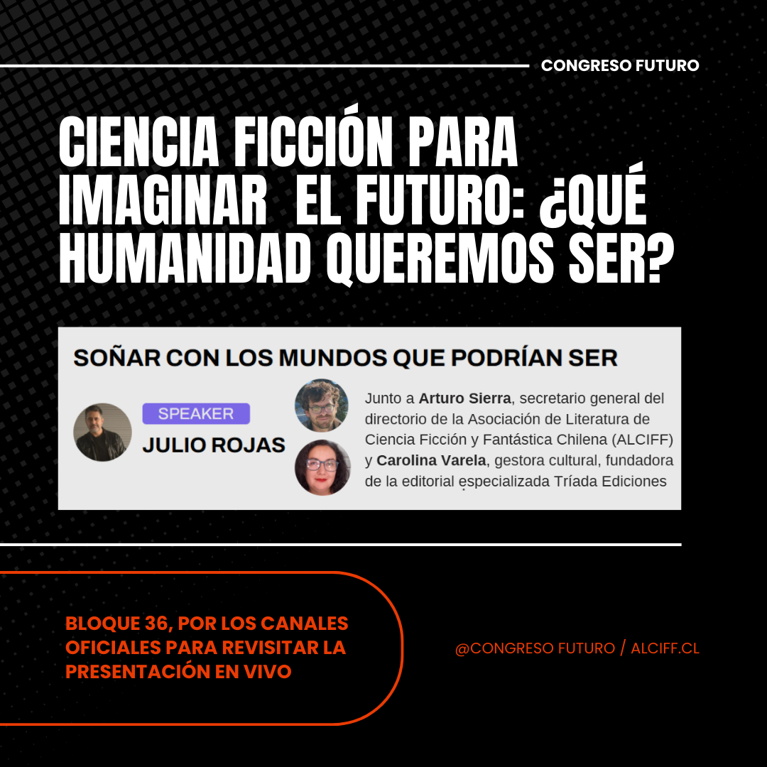 «Este bloque reúne al escritor chileno Julio Rojas junto a Arturo Sierra y Carolina Varela para explorar la ciencia ficción desde una perspectiva nacional. A través de las artes, se reflexiona sobre cómo Chile percibe y proyecta el futuro, ofreciendo un espacio para conectar la creatividad narrativa con los desafíos y posibilidades que nos esperan. Un encuentro para soñar con los mundos que podrían ser y descubrir cómo las historias moldean nuestras visiones del porvenir.»