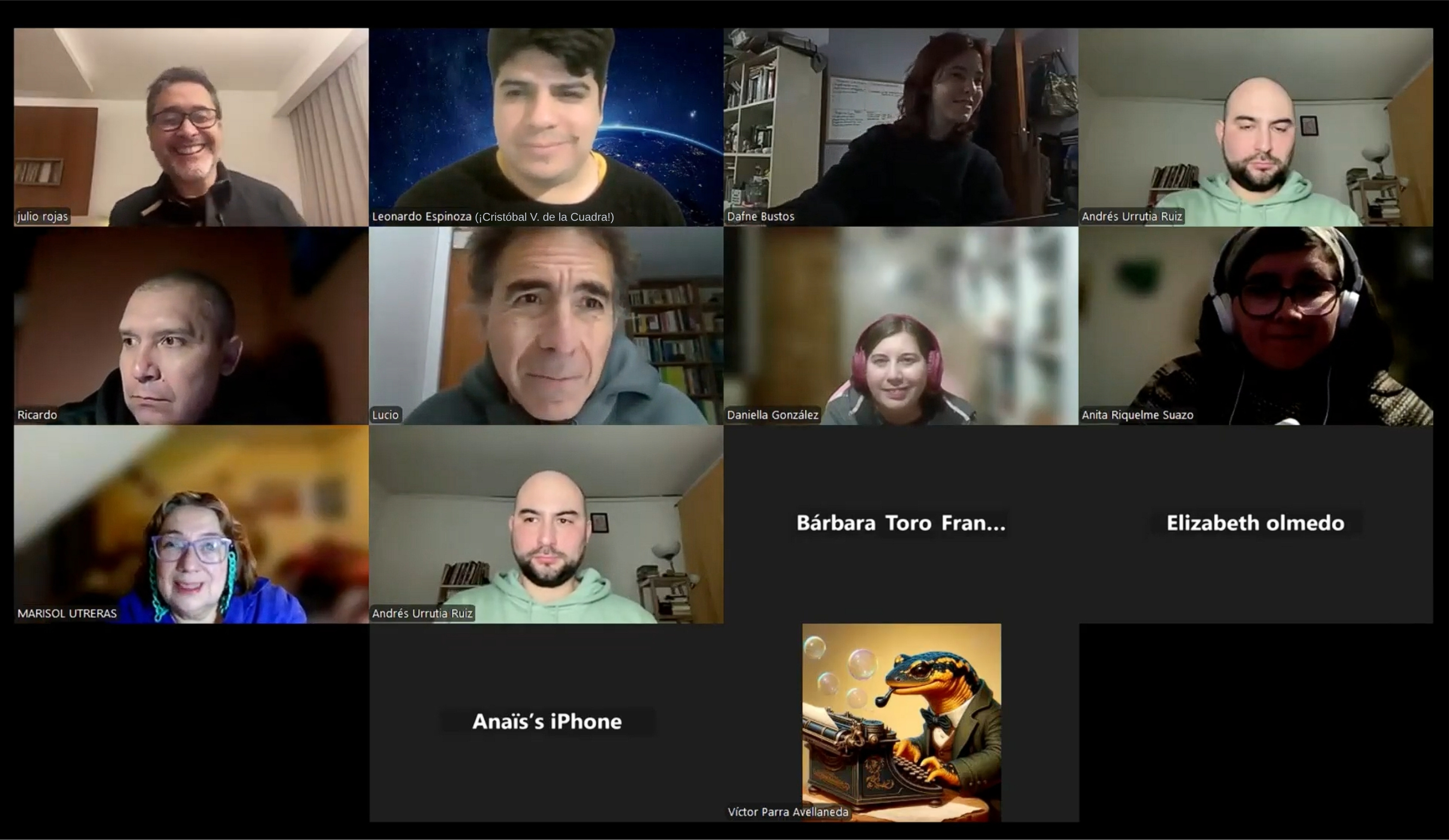 Claro que Cristóbal ya tenía todo —o casi todo— armado cuando me contactó: había hablado con casi todos los tutores a quienes tuve el agrado de conocer y hoy forman parte de una red muy genial de cultores del género de la Ciencia Ficción latinoamericana: Claudia Aboaf desde Argentina, una gran escritora recontra publicada; Carolina Varela desde Chile, editora de Triada, gran aliada desde un tiempo de ALCIFF; Julio Rojas también de Chile, afamado escritor y guionista del podcast Caso 63; César Santivañez desde Perú, director editorial de la revista Future Fiction Magazine en Español;. Luis Carlos Barragán desde Colombia, un ilustrador tan increíble, que nos hizo la hermosa tapa del Fanzín a pesar de estar con tanto trabajo y constantemente viajando; Daniel Figueroa desde Costa Rica, escritor y coordinador del taller de ciencia ficción 13013 y Marilinda Guerrero desde Guatemala, escritora y editora de la editorial Bosques Ambulantes.
