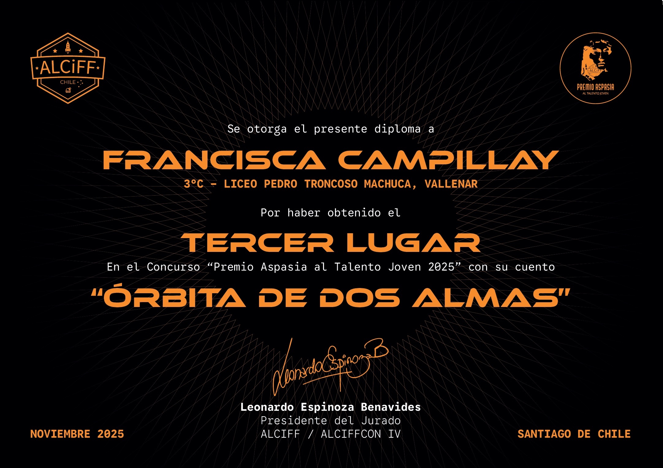 3° lugar: Francisca Campillay, Liceo Pedro Troncoso Machuca, Vallenar. Relato: «Órbita de dos almas».